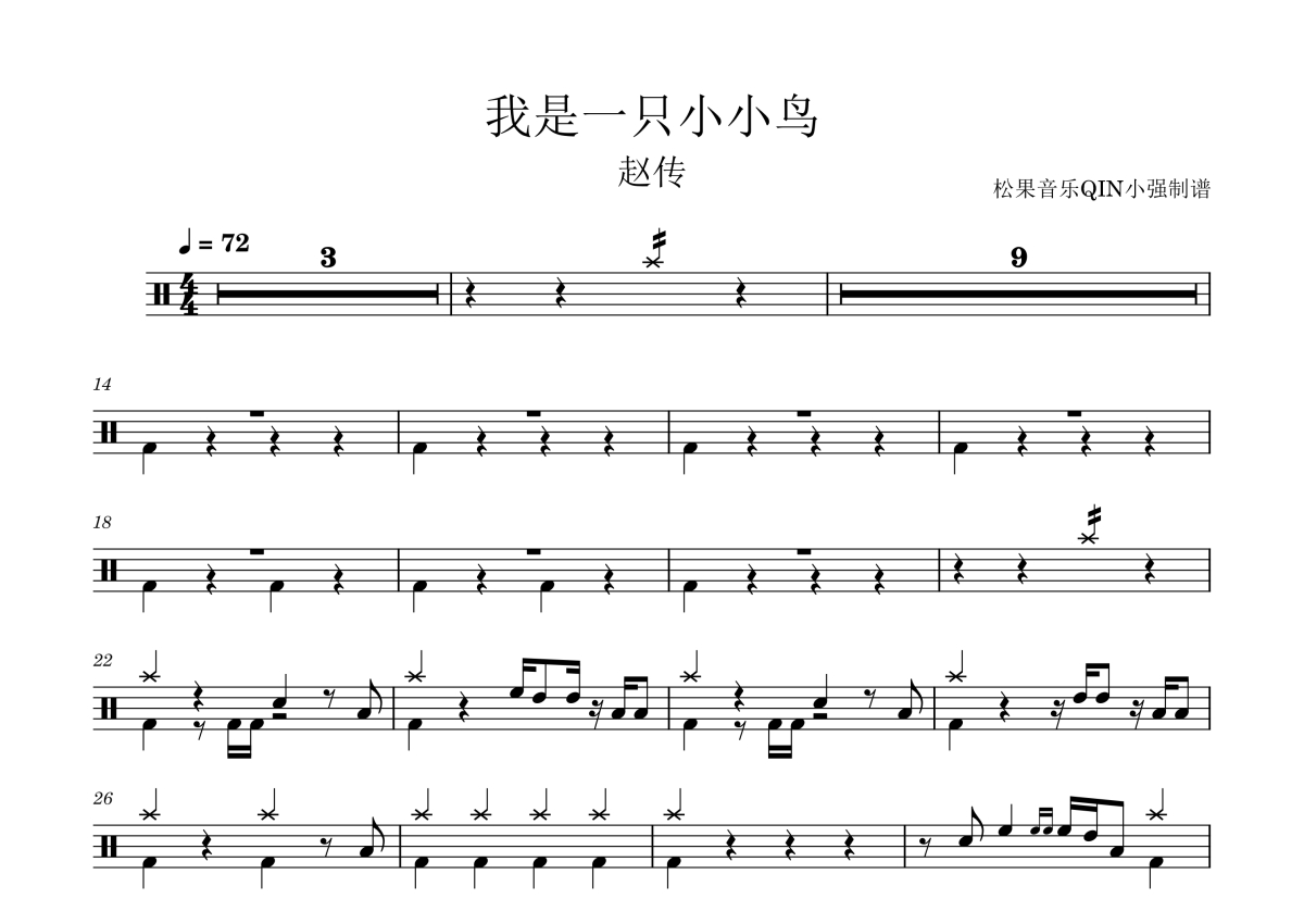 《我是一只小小鸟》是赵传演唱的一首歌曲,拍号为4/4拍,这份架子鼓谱共有两张高清图谱,图谱由 @松果音乐QIN小强 编配上传,图谱使用五线谱编配,使用这份我是一只小小鸟架子鼓谱,你将能够轻松地敲打出这首赵传的我是一只小小鸟,快来尝试吧。《我是一只小小鸟》是赵传演唱的流行歌曲,由李宗盛作词、作曲,Donald Ashley编曲,收录于赵传1990年8月1日发行的同名专辑《我是一只小小鸟》中。