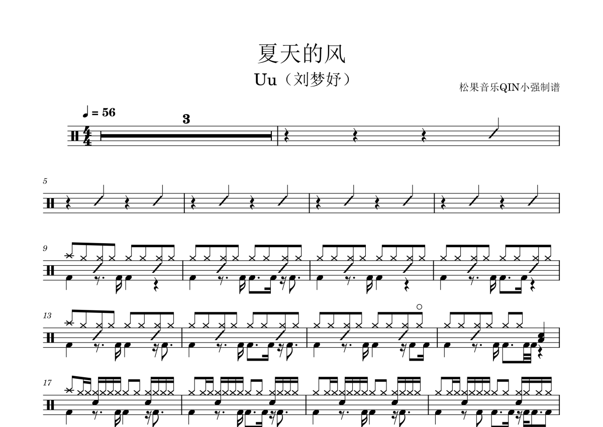 《夏天的风》是Uu(刘梦妤)演唱的一首歌曲,拍号为4/4拍,这份架子鼓谱共有两张高清图谱,图谱由 @松果音乐QIN小强 编配上传,图谱使用五线谱编配,使用这份夏天的风架子鼓谱,你将能够轻松地敲打出这首Uu(刘梦妤)的夏天的风,快来尝试吧。《夏天的风》是由梁鸿斌(P.K.A天天)作词,周杰伦作曲,Uu(刘梦妤)演唱的歌曲,收录于同名专辑《夏天的风》,发行于2020年4月16日。