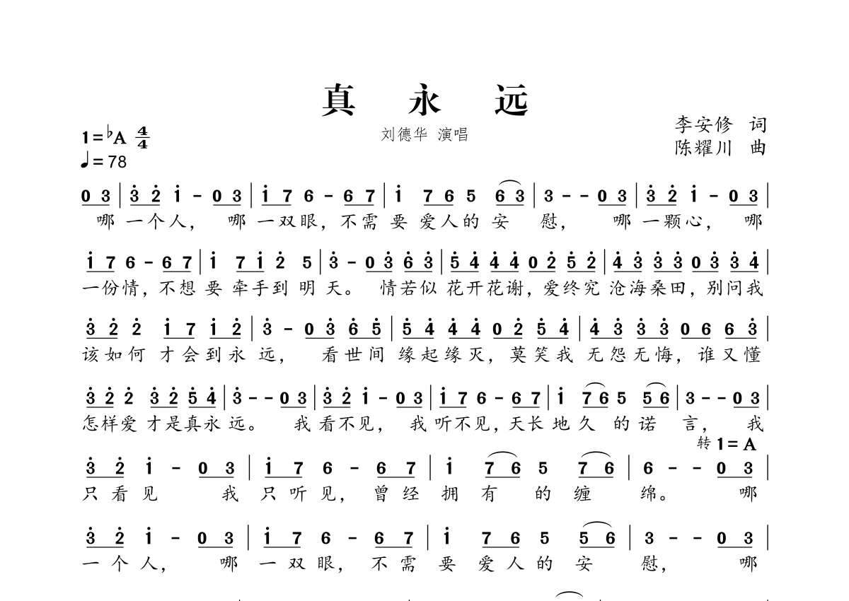 《真永远》是刘德华演唱的一首歌曲,拍号为4/4拍,歌曲速度为每分钟78拍,这份简谱共有一张高清图谱,图谱由 @独行侠 编配上传。