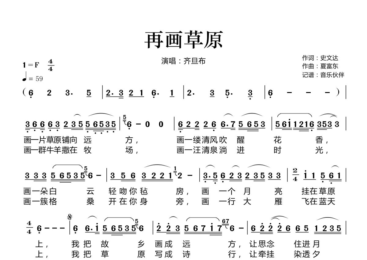 《再画草原》是齐旦布演唱的一首歌曲,这份简谱共有一张高清图谱,图谱由 @音乐伙伴 编配上传。