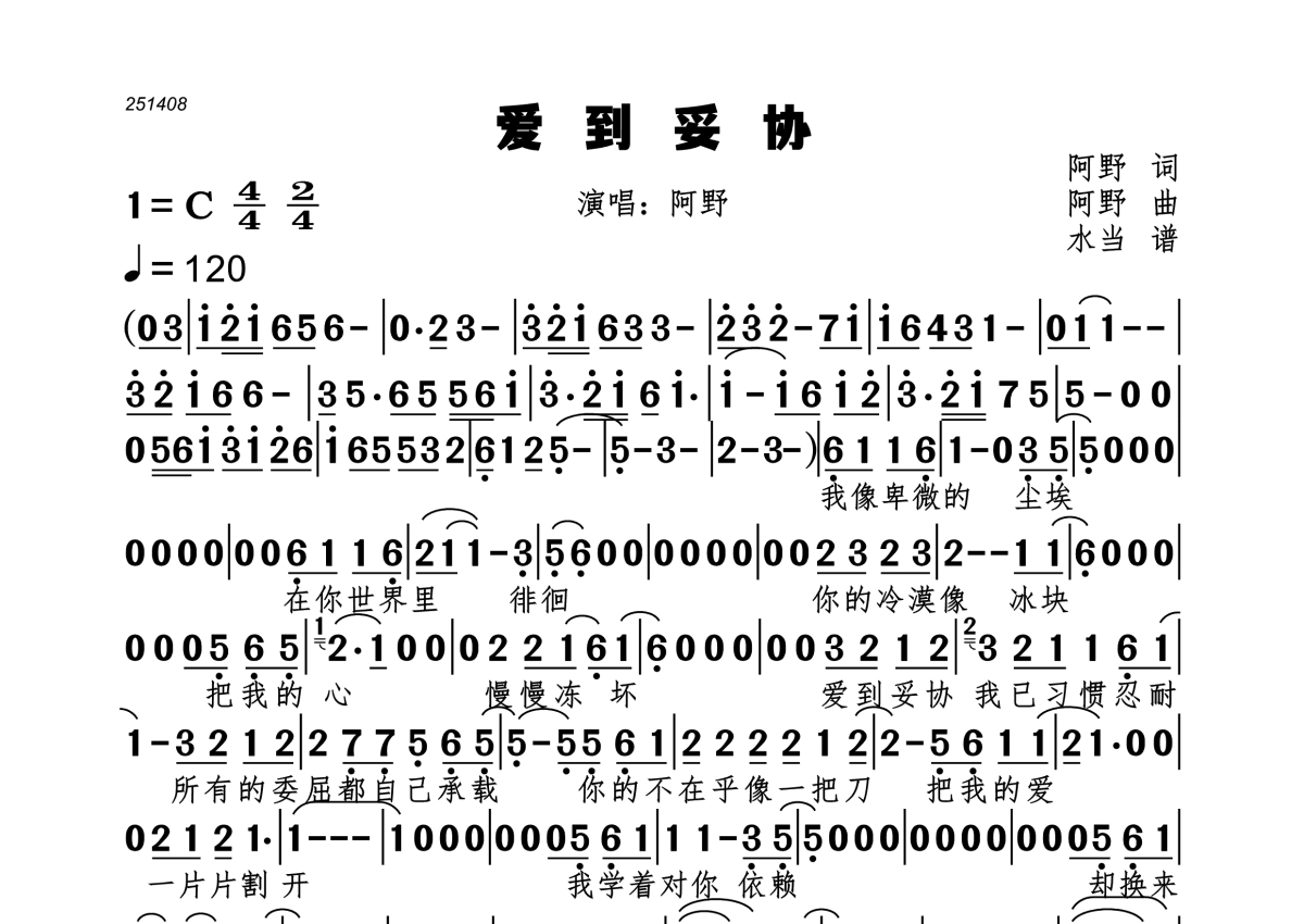 《爱到妥协》是阿野演唱的一首歌曲,拍号为4/4拍,歌曲速度为每分钟120拍,这份简谱共有一张高清图谱,图谱由 @水当 编配上传。