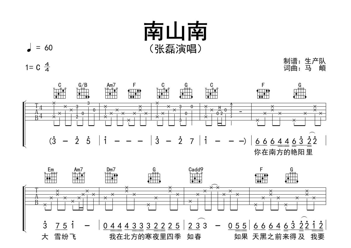 《南山南》是张磊演唱的一首歌曲,精编完美版,拍号为4/4拍,歌曲速度为每分钟60拍,歌曲原调为C调,本吉他谱采用的是C调指法编配,演奏时不需要使用变调夹即为原调,这份吉他谱共有三张高清图谱,图谱由 @生产队 编配上传,图谱使用六线谱编配,包含吉他和弦指法、简谱以及歌词部分,使用这份南山南吉他谱,可以让你更加方便地掌握这首歌曲的弹唱技巧,快来尝试吧。张磊演唱的民谣歌曲《南山南》原版吉他谱,含精准的前奏、间奏、尾奏solo编配,精编完美版,优质推荐!。