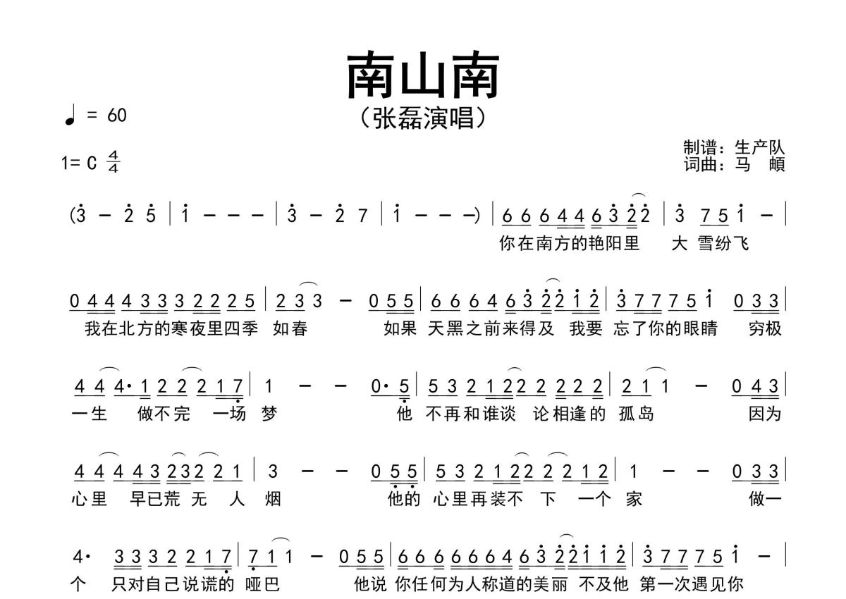 《南山南》是张磊演唱的一首歌曲,原版简谱,拍号为4/4拍,歌曲速度为每分钟60拍,这份简谱共有一张高清图谱,图谱由 @生产队 编配上传张磊演唱的民谣歌曲《南山南》原版简谱,含精准的前奏、间奏、尾奏solo编配,精编完美版,优质推荐!。