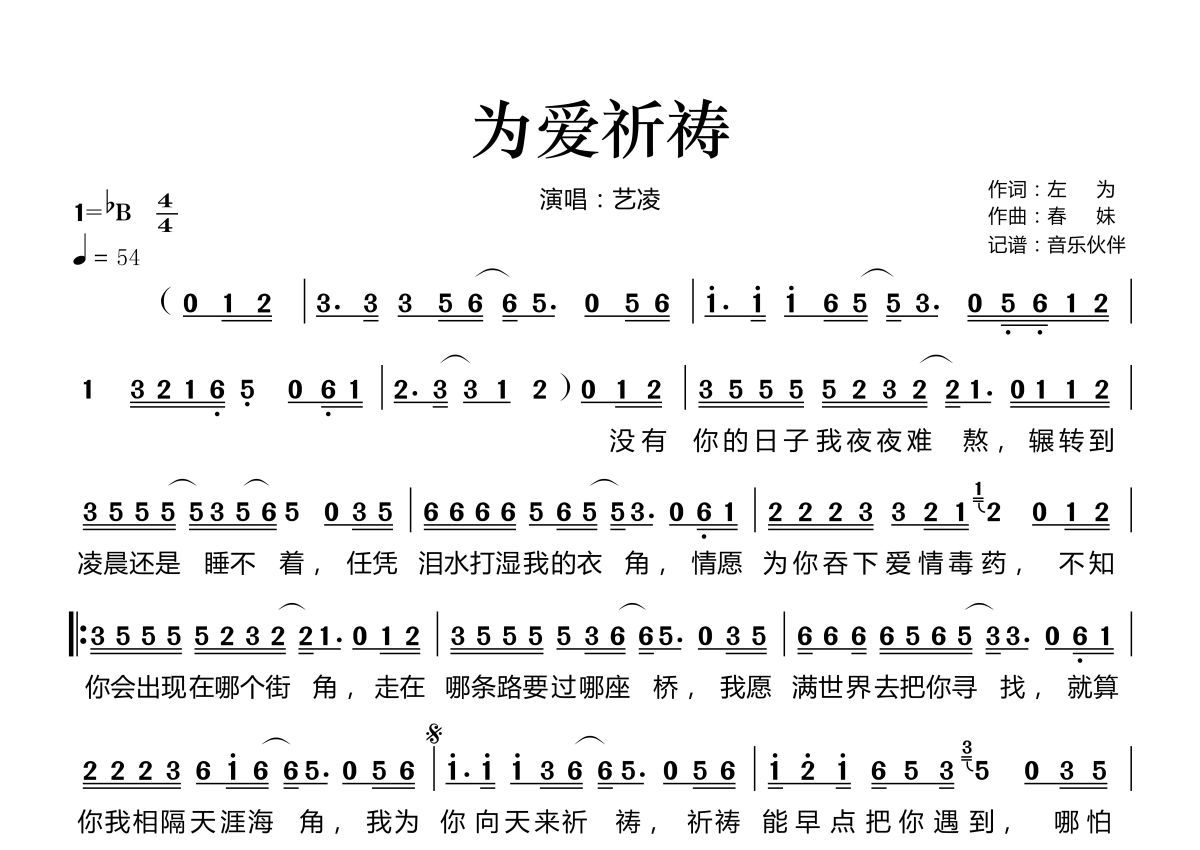 《为爱祈祷》是艺凌演唱的一首歌曲,拍号为4/4拍,歌曲速度为每分钟54拍,这份简谱共有一张高清图谱,图谱由 @音乐伙伴 编配上传。