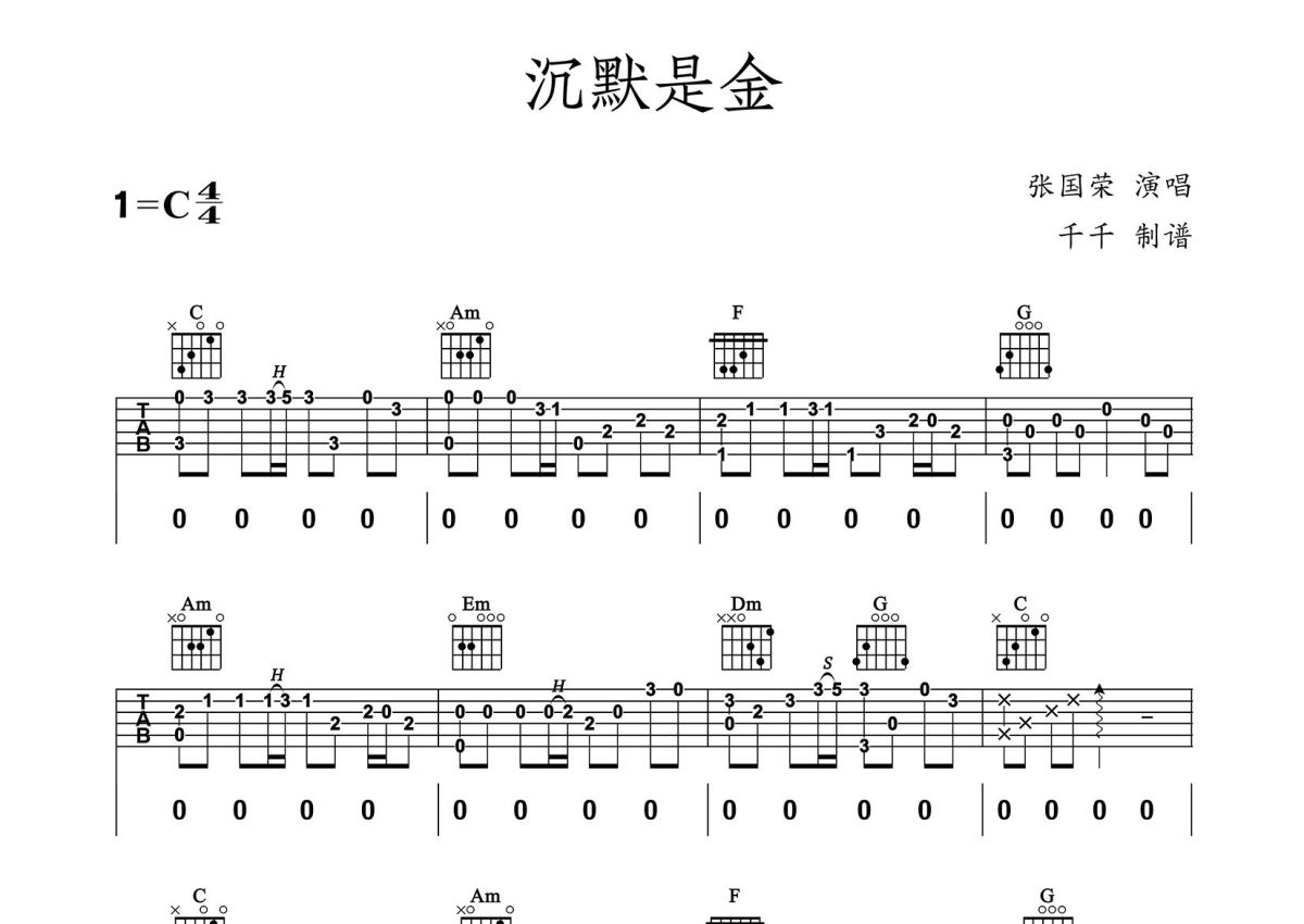 沉默是金吉他谱 - 张国荣演唱 - C调弹唱六线谱