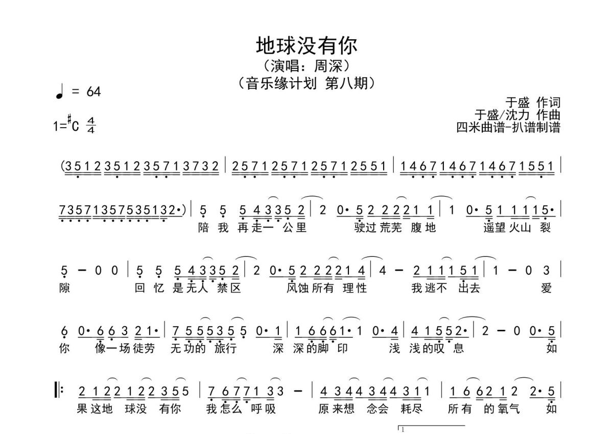 《地球没有你》是周深演唱的一首歌曲,拍号为4/4拍,这份简谱共有一张高清图谱,图谱由 @SRV7758521 编配上传。