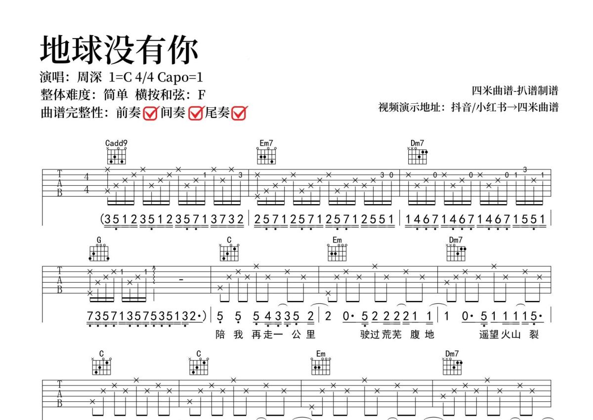 周深《地球没有你》吉他谱 - C调弹唱六线谱