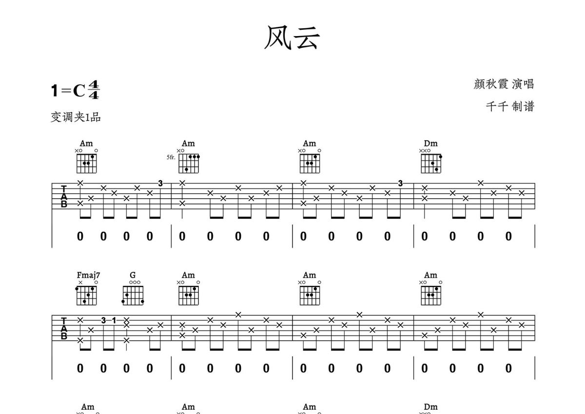 颜秋霞《风云》吉他谱 - C调弹唱六线谱