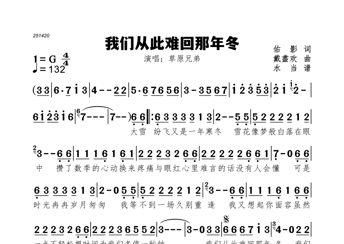 《我们从此难回那年冬》是草原兄弟演唱的一首歌曲,拍号为4/4拍,歌曲速度为每分钟132拍,这份简谱共有一张高清图谱,图谱由 @水当 编配上传。