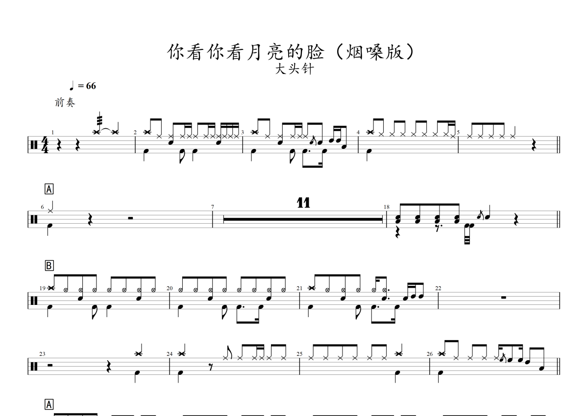 大头针《你看你看月亮的脸(烟嗓版)》架子鼓谱