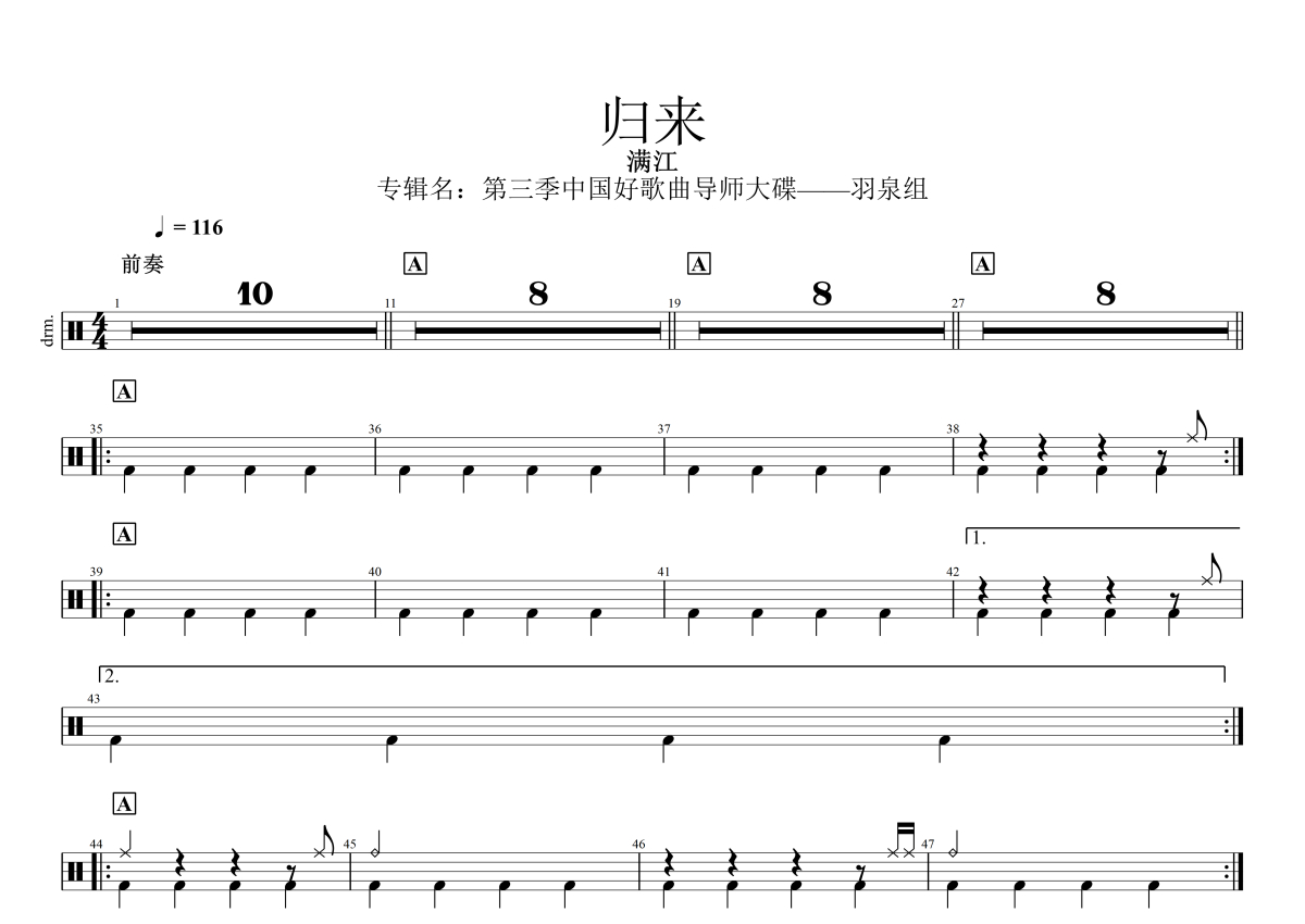 《归来》是满江演唱的一首歌曲,这份架子鼓谱共有两张高清图谱,图谱由 @小东鼓谱 编配上传,图谱使用五线谱编配,使用这份归来架子鼓谱,你将能够轻松地敲打出这首满江的归来,快来尝试吧。