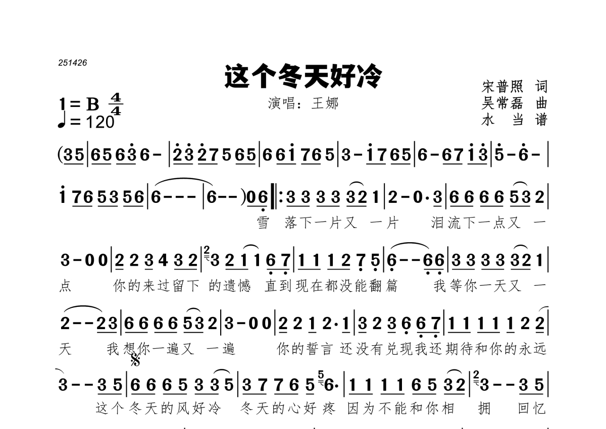 《这个冬天好冷》是王娜演唱的一首歌曲,拍号为4/4拍,歌曲速度为每分钟120拍,这份简谱共有一张高清图谱,图谱由 @水当 编配上传。