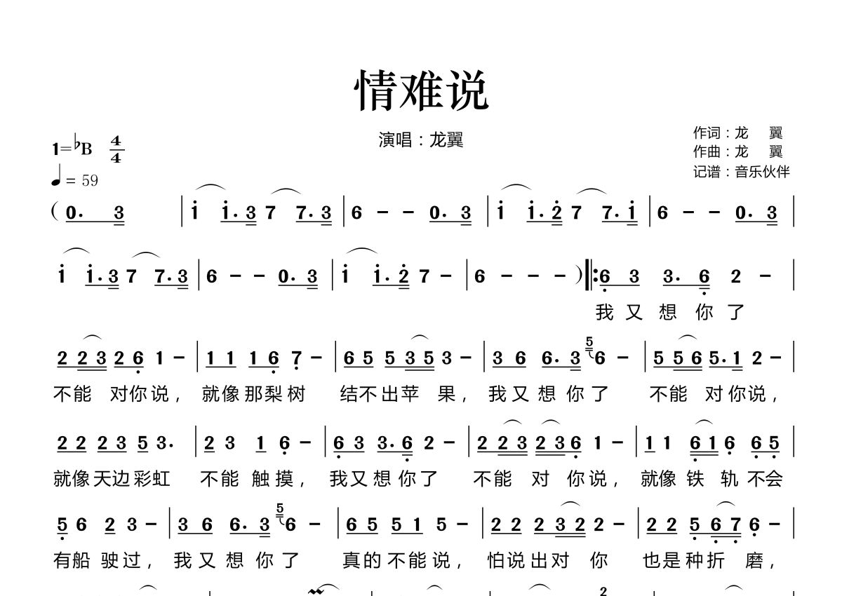 《情难说》是龙翼演唱的一首歌曲,拍号为4/4拍,歌曲速度为每分钟59拍,这份简谱共有一张高清图谱,图谱由 @音乐伙伴 编配上传。