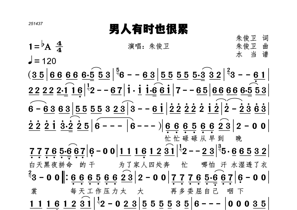 男人有时也很累简谱 - 朱俊卫演唱