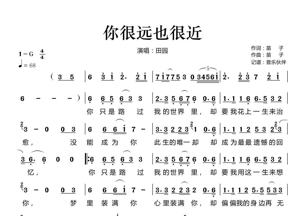 《你很远也很近》是田园演唱的一首歌曲,拍号为4/4拍,歌曲速度为每分钟68拍,这份简谱共有一张高清图谱,图谱由 @音乐伙伴 编配上传。