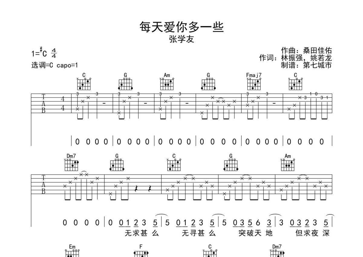 张学友《每天爱你多一些》吉他谱 - C调弹唱六线谱