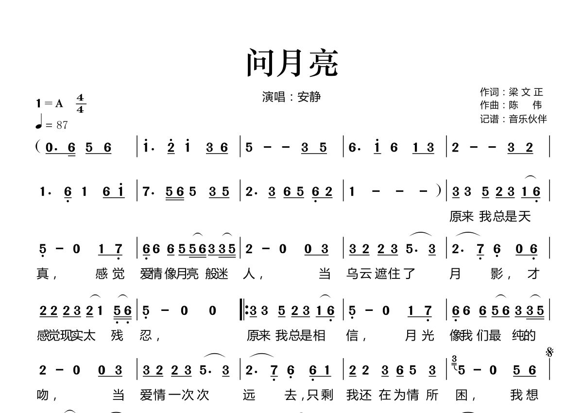《问月亮》是安静演唱的一首歌曲,拍号为4/4拍,歌曲速度为每分钟87拍,这份简谱共有一张高清图谱,图谱由 @音乐伙伴 编配上传。