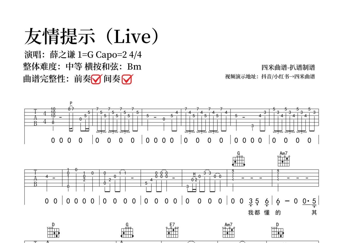 薛之谦《友情提示》吉他谱 - G调弹唱六线谱