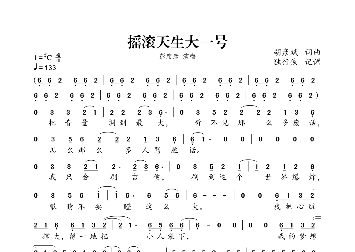 《摇滚天生大一号》是彭席彦演唱的一首歌曲,拍号为4/4拍,歌曲速度为每分钟133拍,这份简谱共有两张高清图谱,图谱由 @独行侠 编配上传。