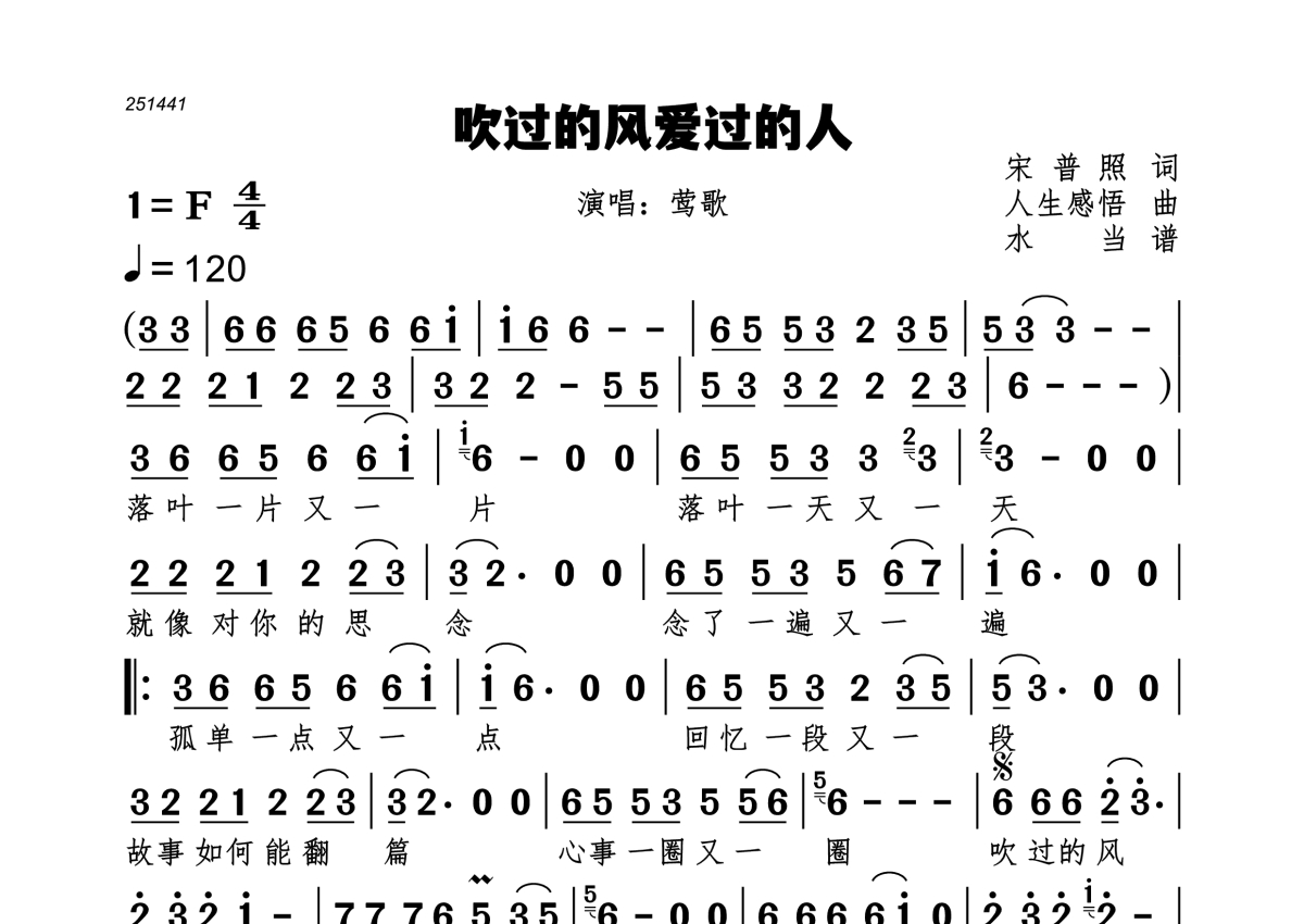 《吹过的风爱过的人》是莺歌演唱的一首歌曲,拍号为4/4拍,歌曲速度为每分钟120拍,这份简谱共有一张高清图谱,图谱由 @水当 编配上传。
