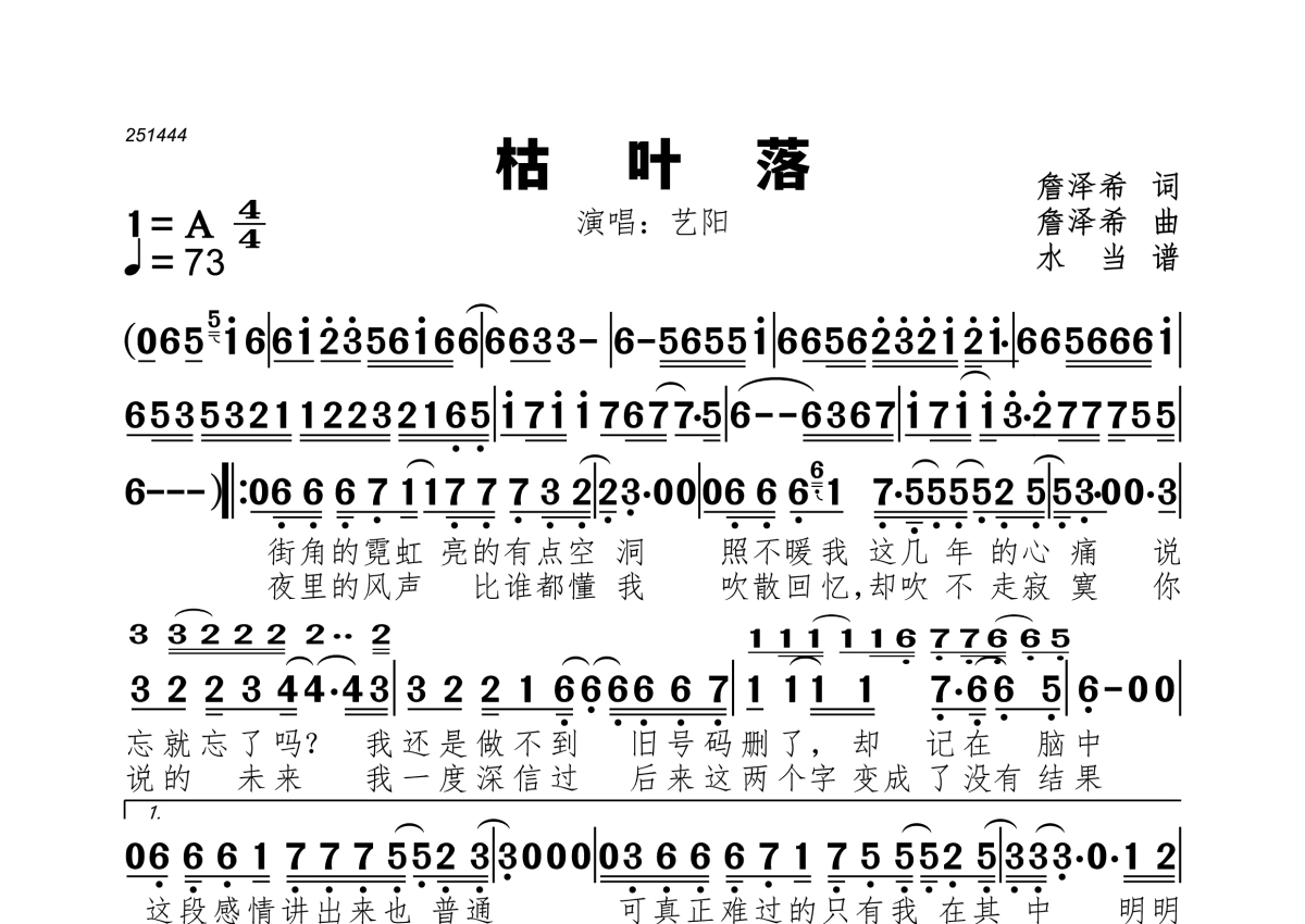 《枯叶落》是艺阳演唱的一首歌曲,拍号为4/4拍,歌曲速度为每分钟73拍,这份简谱共有一张高清图谱,图谱由 @水当 编配上传。