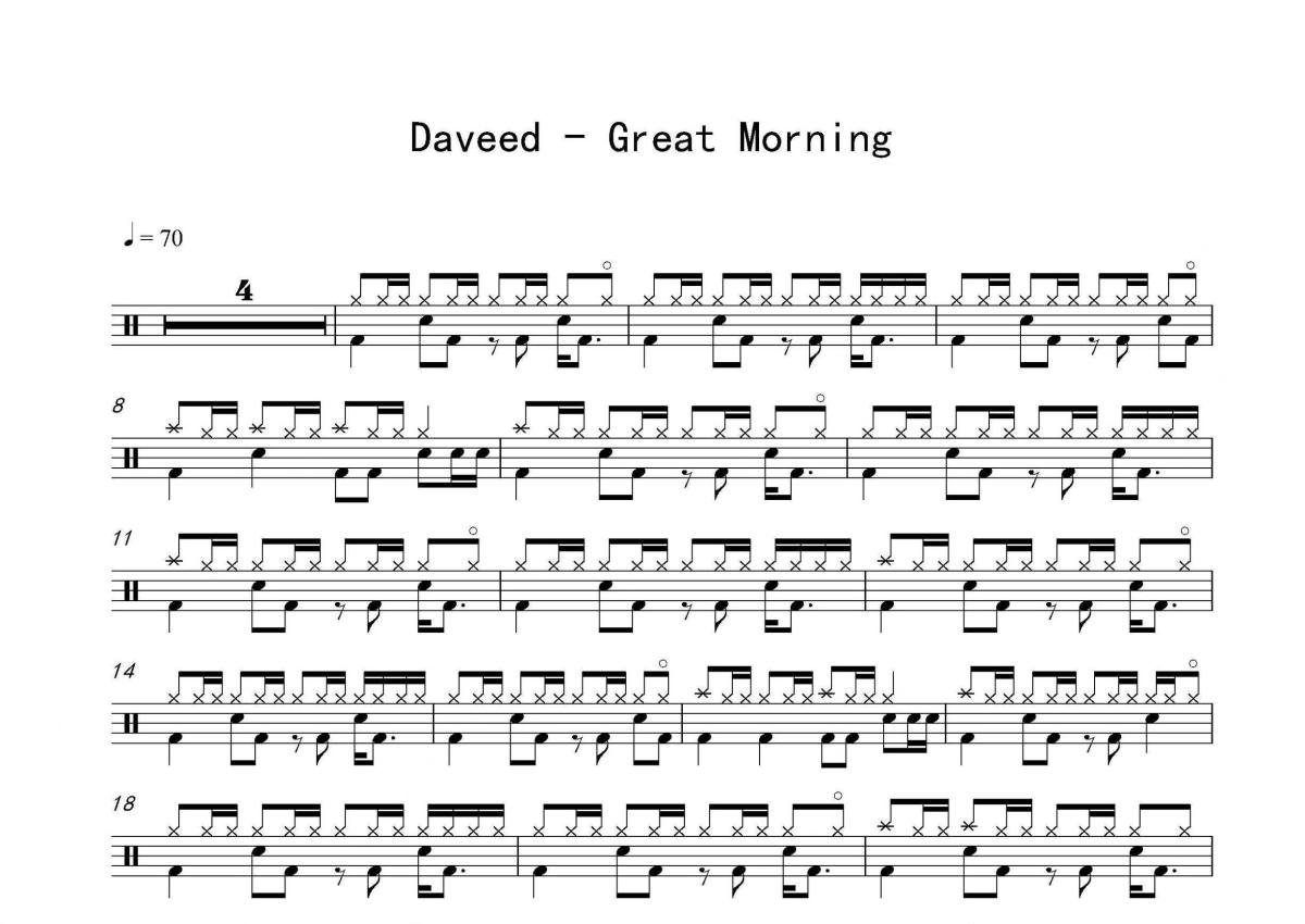 《Great Morning》是Daveed演唱的一首歌曲,拍号为4/4拍,歌曲速度为每分钟70拍,这份架子鼓谱共有两张高清图谱,图谱由 @音符喷血者 编配上传,图谱使用五线谱编配,使用这份Great Morning架子鼓谱,你将能够轻松地敲打出这首Daveed的Great Morning,快来尝试吧。