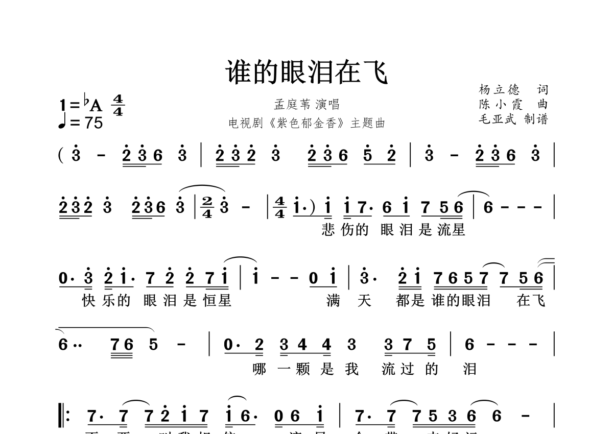 《谁的眼泪在飞》是孟庭苇演唱的一首歌曲,拍号为4/4拍,这份简谱共有两张高清图谱,图谱由 @秋天的童话 编配上传。