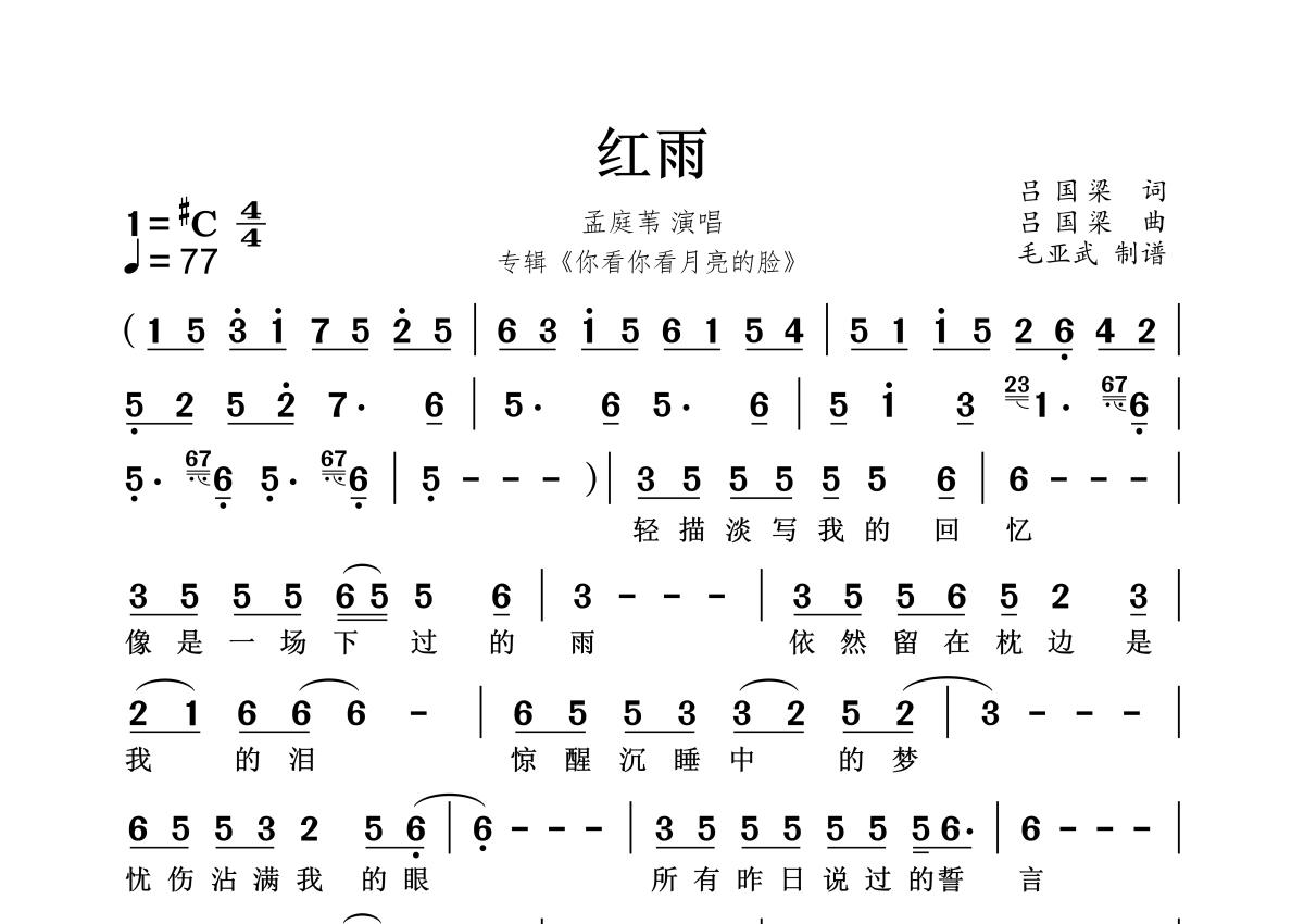 《红雨》是孟庭苇演唱的一首歌曲,拍号为4/4拍,这份简谱共有两张高清图谱,图谱由 @秋天的童话 编配上传。