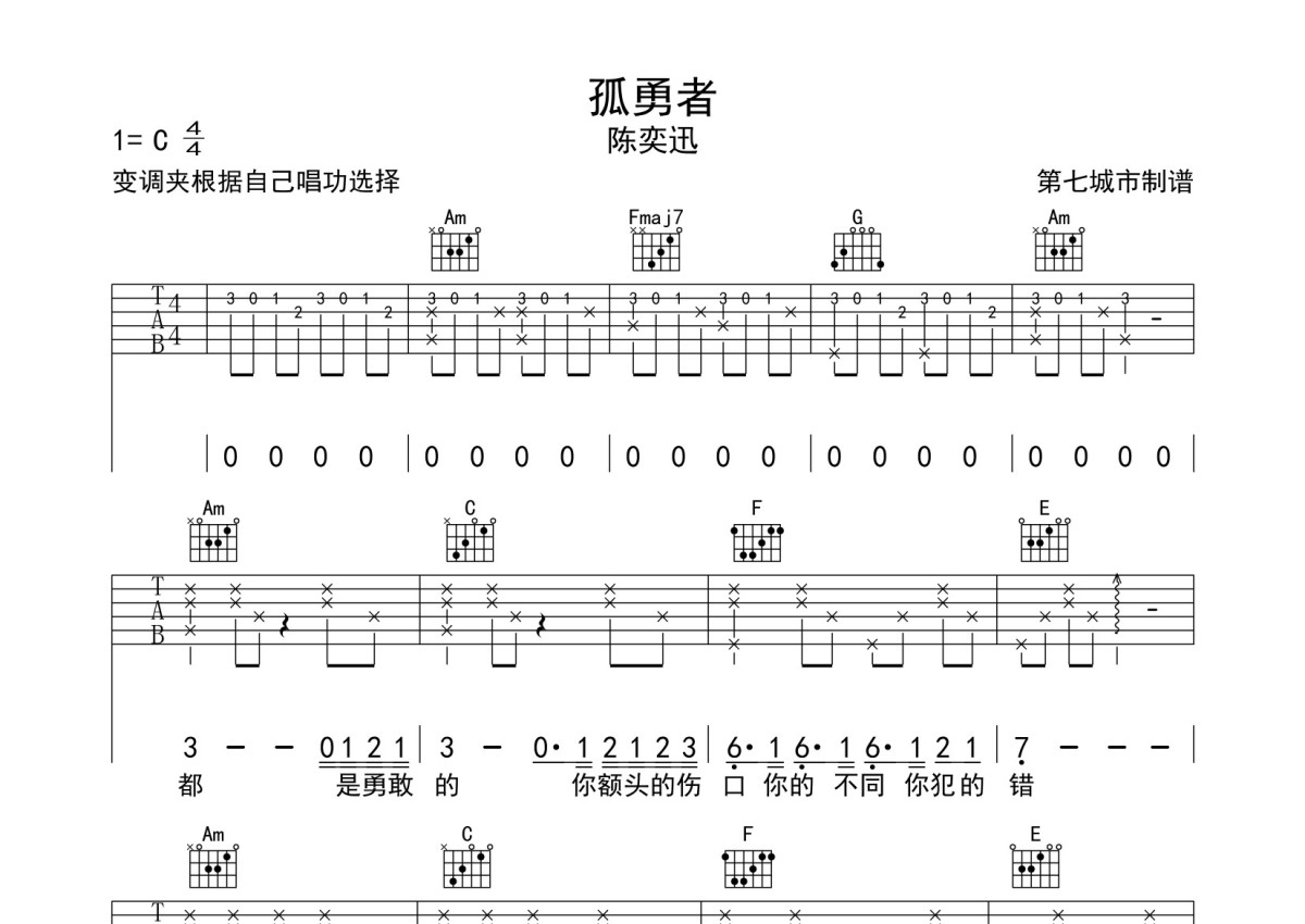 陈奕迅《孤勇者》吉他谱 - C调弹唱六线谱