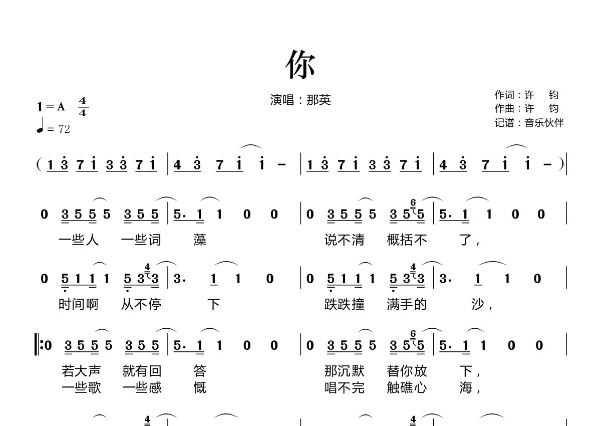 《你》是那英演唱的一首歌曲,拍号为4/4拍,歌曲速度为每分钟72拍,这份简谱共有两张高清图谱,图谱由 @音乐伙伴 编配上传。