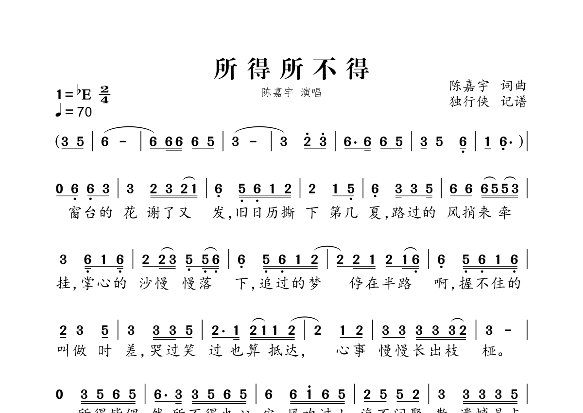 《所得所不得》是陈嘉宇演唱的一首歌曲,拍号为2/4拍,歌曲速度为每分钟70拍,这份简谱共有两张高清图谱,图谱由 @独行侠 编配上传。