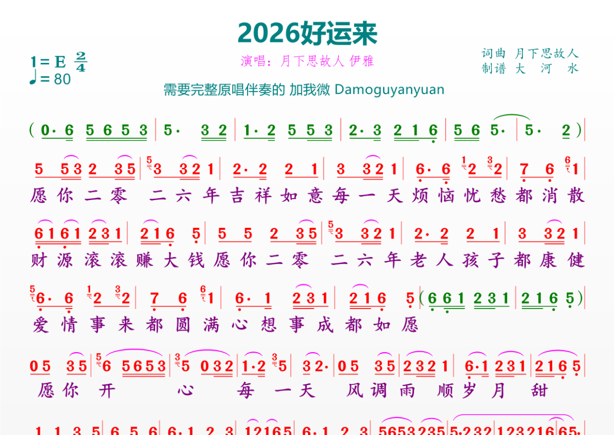 《2026好运来》是月下思故人 伊雅演唱的一首歌曲,拍号为2/4拍,歌曲速度为每分钟80拍,这份简谱共有一张高清图谱,图谱由 @临海雪原 编配上传。