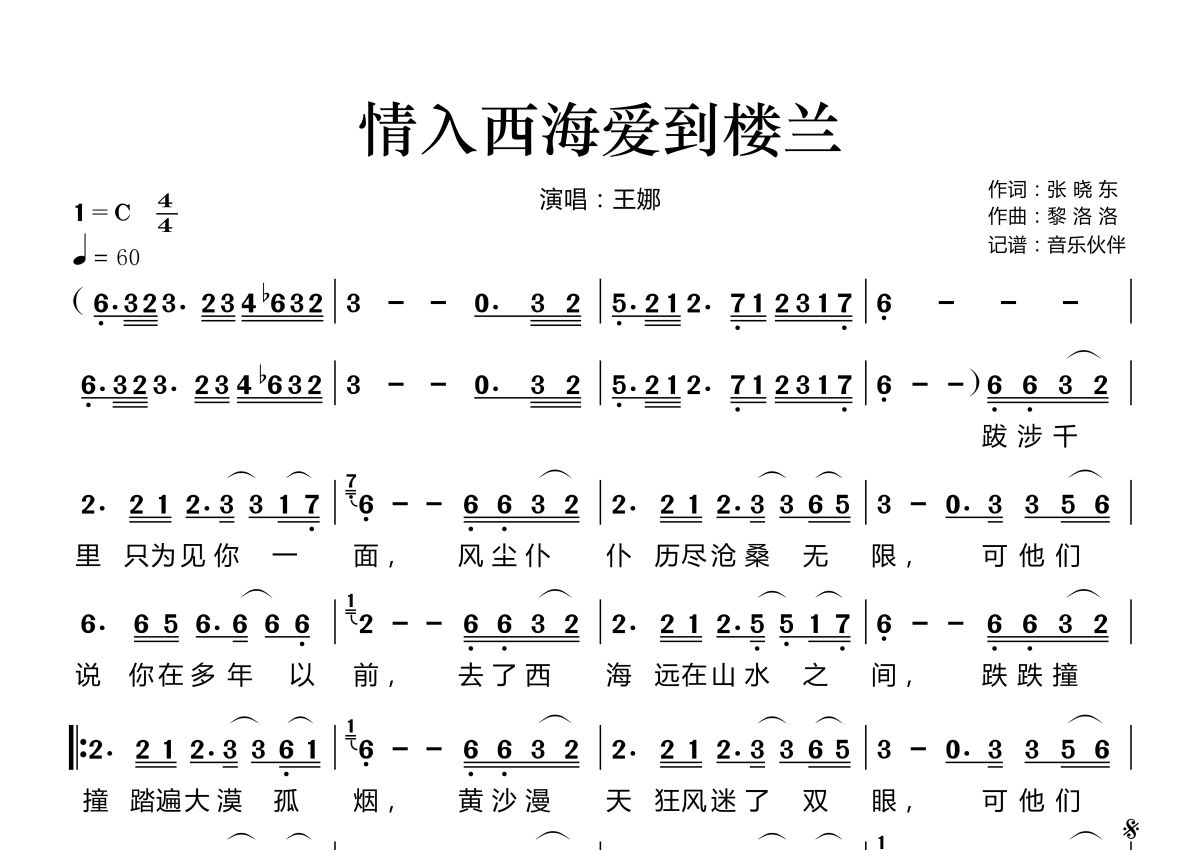 《情入西海爱到楼兰》是王娜演唱的一首歌曲,拍号为4/4拍,歌曲速度为每分钟60拍,这份简谱共有一张高清图谱,图谱由 @音乐伙伴 编配上传。