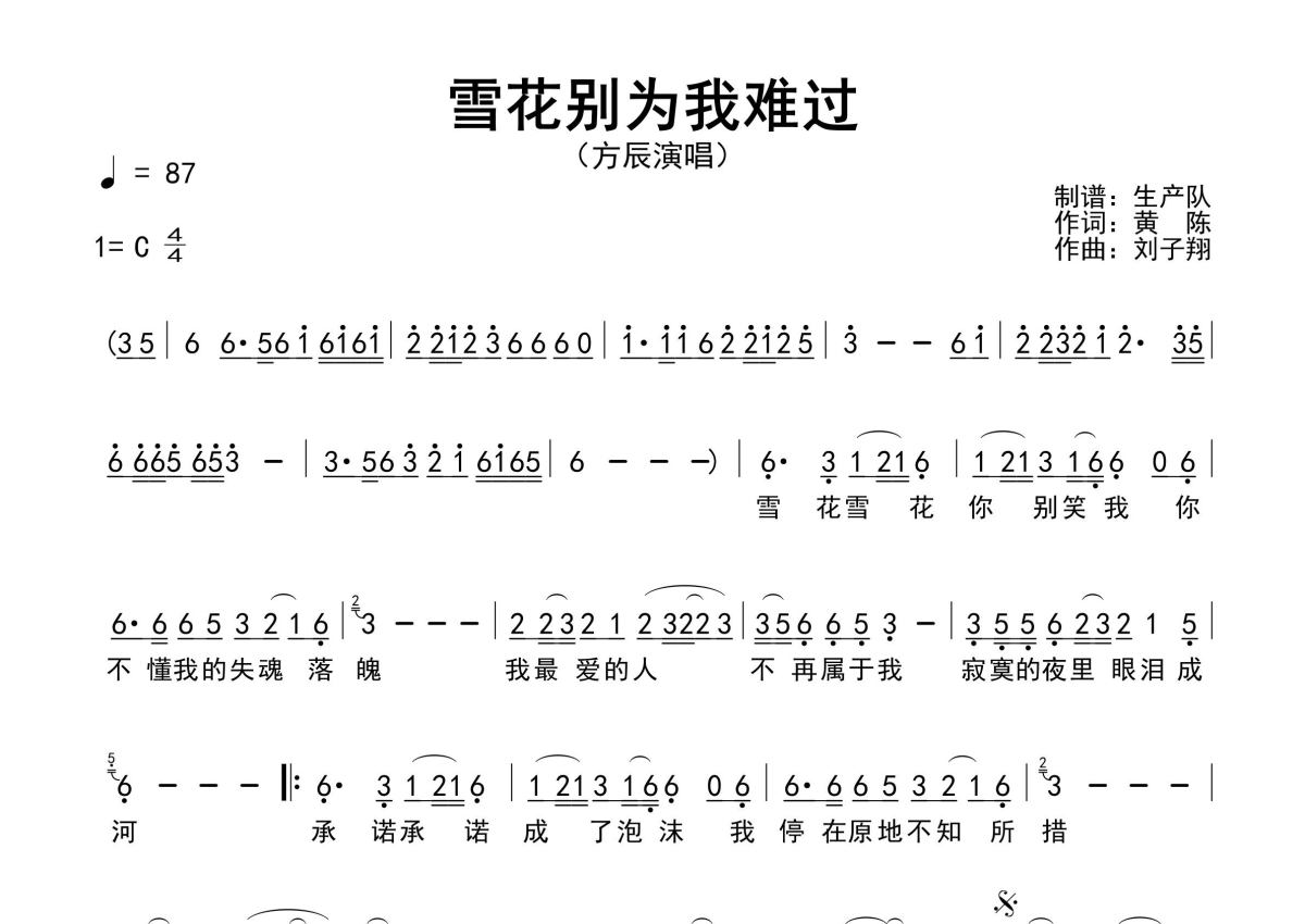 《雪花别为我难过》是方辰演唱的一首歌曲,原版简谱,拍号为4/4拍,歌曲速度为每分钟87拍,这份简谱共有一张高清图谱,图谱由 @生产队 编配上传方辰演唱的歌曲《雪花别为我难过》原版简谱,含精准的前奏、间奏、尾奏solo编配,精编完美版,优质推荐!。