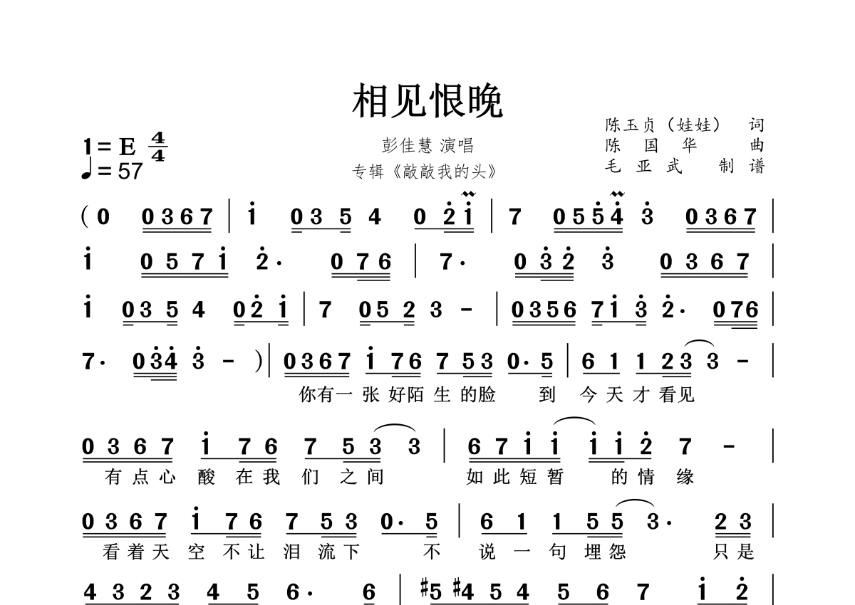 《相见恨晚》是彭佳慧演唱的一首歌曲,拍号为4/4拍,这份简谱共有两张高清图谱,图谱由 @秋天的童话 编配上传。