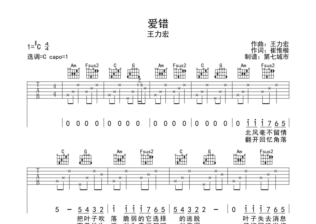 王力宏《爱错》吉他谱 - 弹唱六线谱