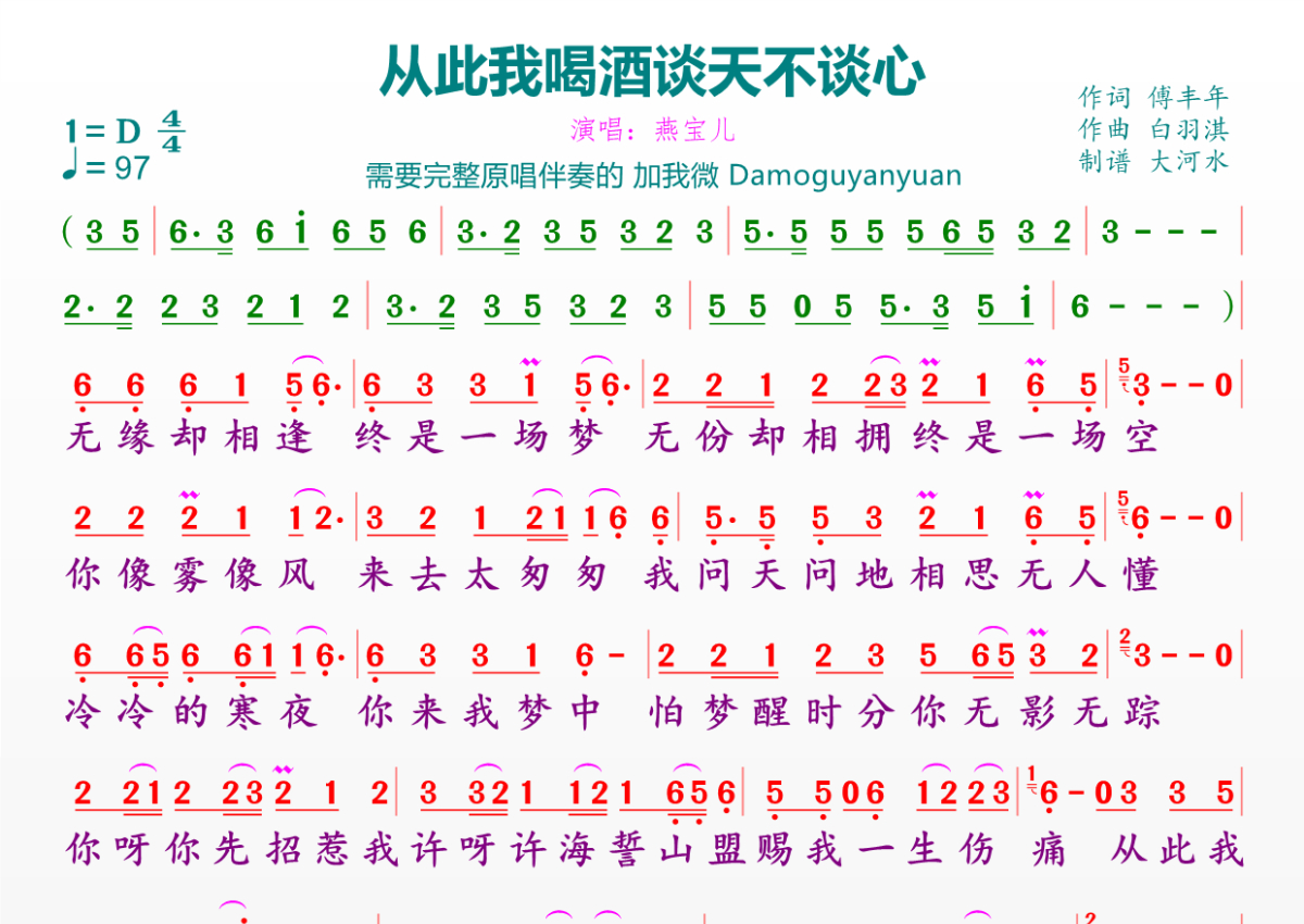 《从此我喝酒谈天不谈心》是燕宝儿演唱的一首歌曲,拍号为4/4拍,歌曲速度为每分钟97拍,这份简谱共有一张高清图谱,图谱由 @临海雪原 编配上传。