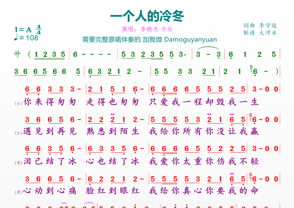 《一个人的冷冬》是李晓杰 方辰演唱的一首歌曲,拍号为4/4拍,歌曲速度为每分钟108拍,这份简谱共有一张高清图谱,图谱由 @临海雪原 编配上传。