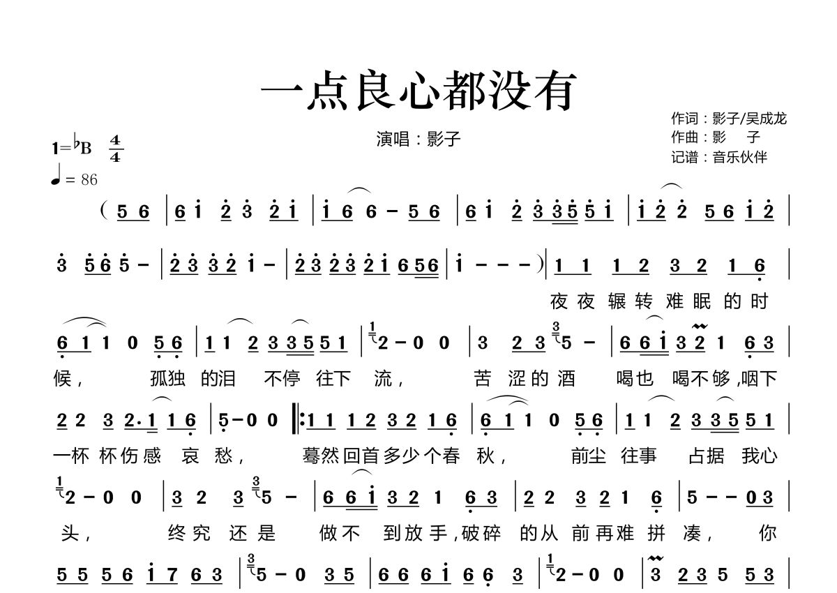 《一点良心都没有》是影子演唱的一首歌曲,拍号为4/4拍,歌曲速度为每分钟86拍,这份简谱共有一张高清图谱,图谱由 @音乐伙伴 编配上传。