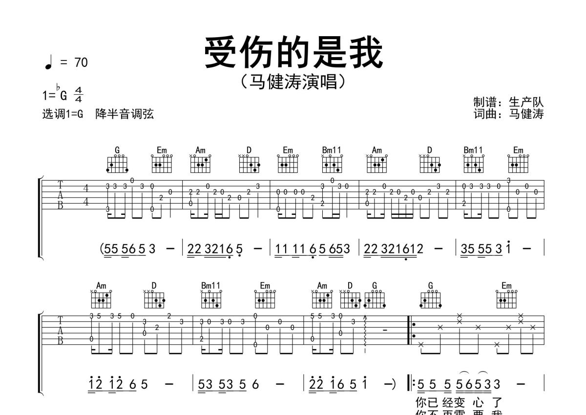 《受伤的是我》是马健涛演唱的一首歌曲,精编完美版,拍号为4/4拍,歌曲速度为每分钟70拍,歌曲原调为Gb调,但由于原调指法比较难,为了方便弹奏,本吉他谱采用的是G调指法编配,降半音调弦弹奏即为原调,当然也可以根据自己的音域决定是否调弦,这份吉他谱共有两张高清图谱,图谱由 @生产队 编配上传,图谱使用六线谱编配,包含吉他和弦指法、简谱以及歌词部分,使用这份受伤的是我吉他谱,可以让你更加方便地掌握这首歌曲的弹唱技巧,快来尝试吧。马健涛作词、作曲并演唱的歌曲《受伤的是我》原版吉他谱,含精准的前奏、间奏solo编配,精编完美版,优质推荐!。