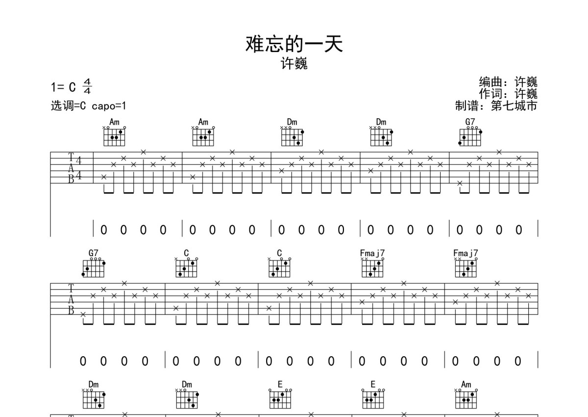 许巍《难忘的一天》吉他谱 - C调弹唱六线谱