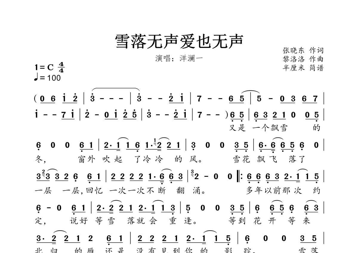 雪落无声爱也无声简谱 - 洋澜一演唱