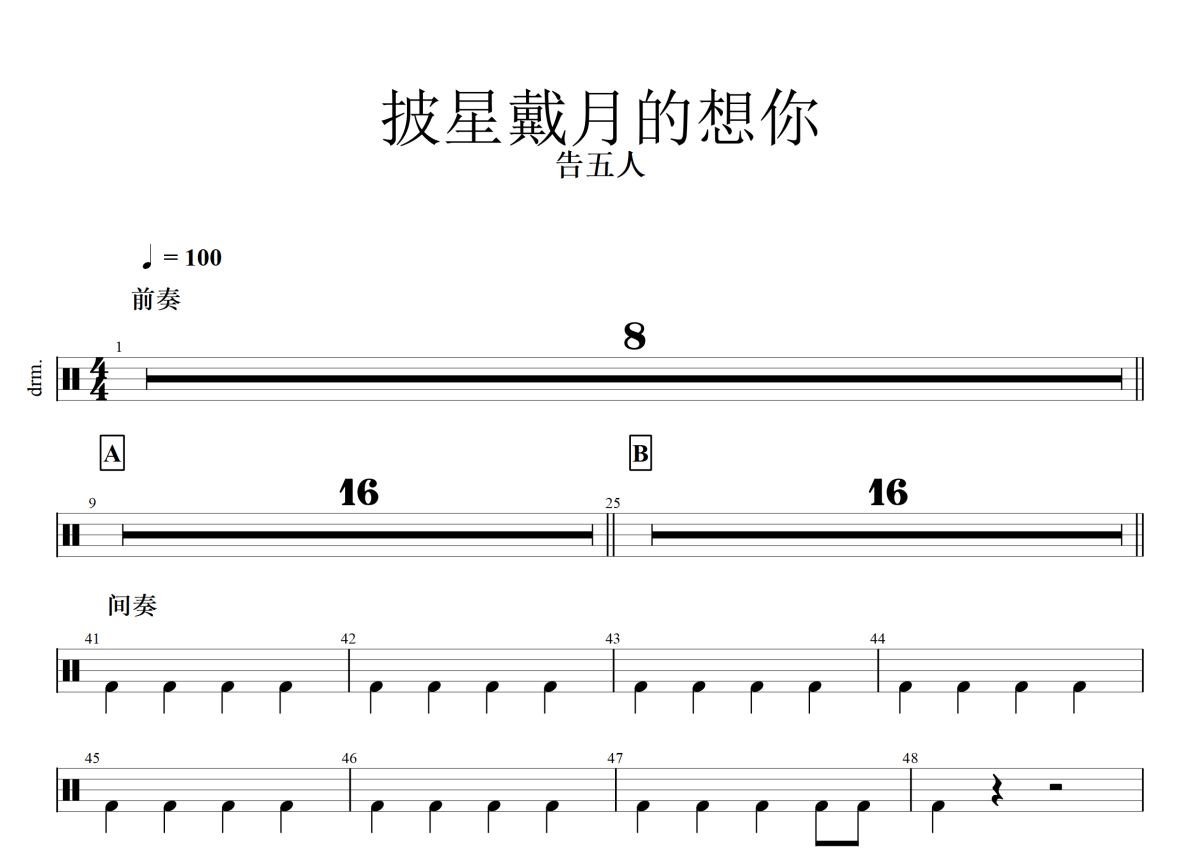披星戴月的想你架子鼓谱 - 告五人演唱