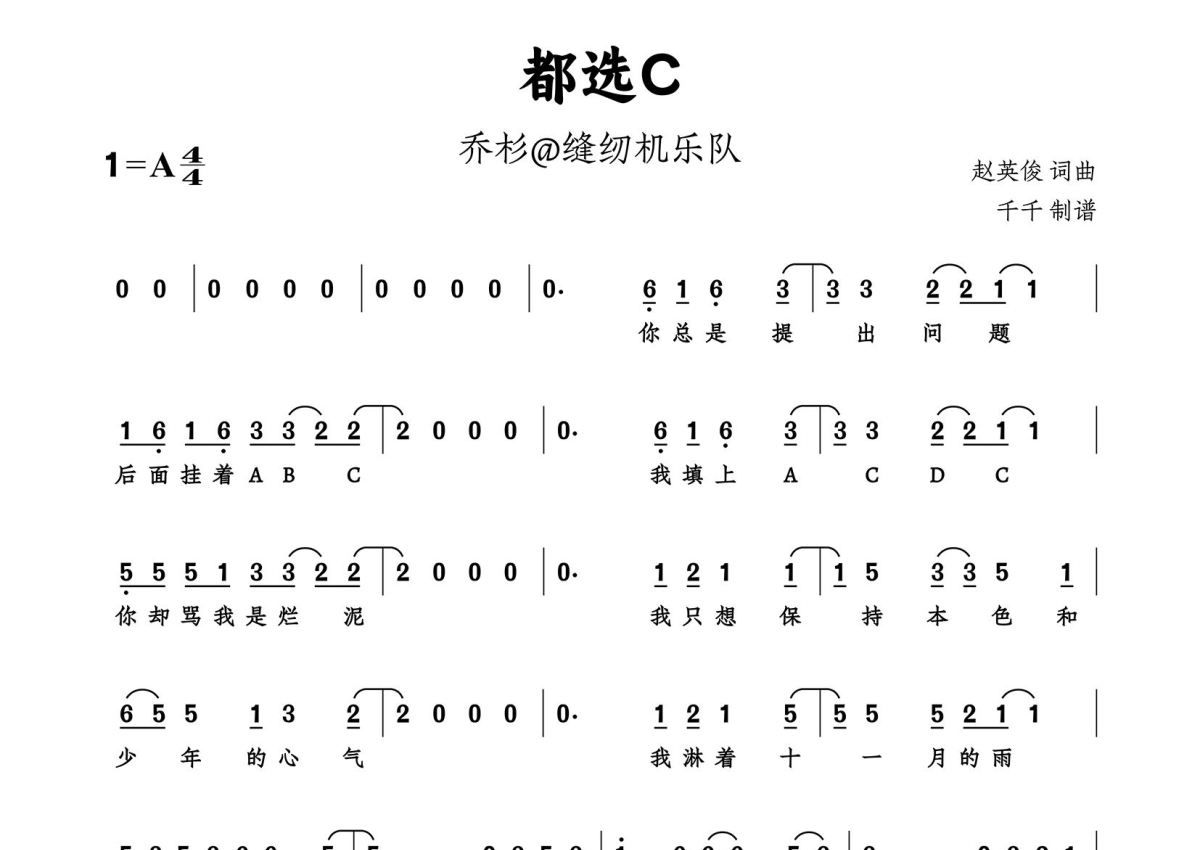 《都选C》是缝纫机乐队演唱的一首歌曲,拍号为4/4拍,这份简谱共有两张高清图谱,图谱由 @千千 编配上传。