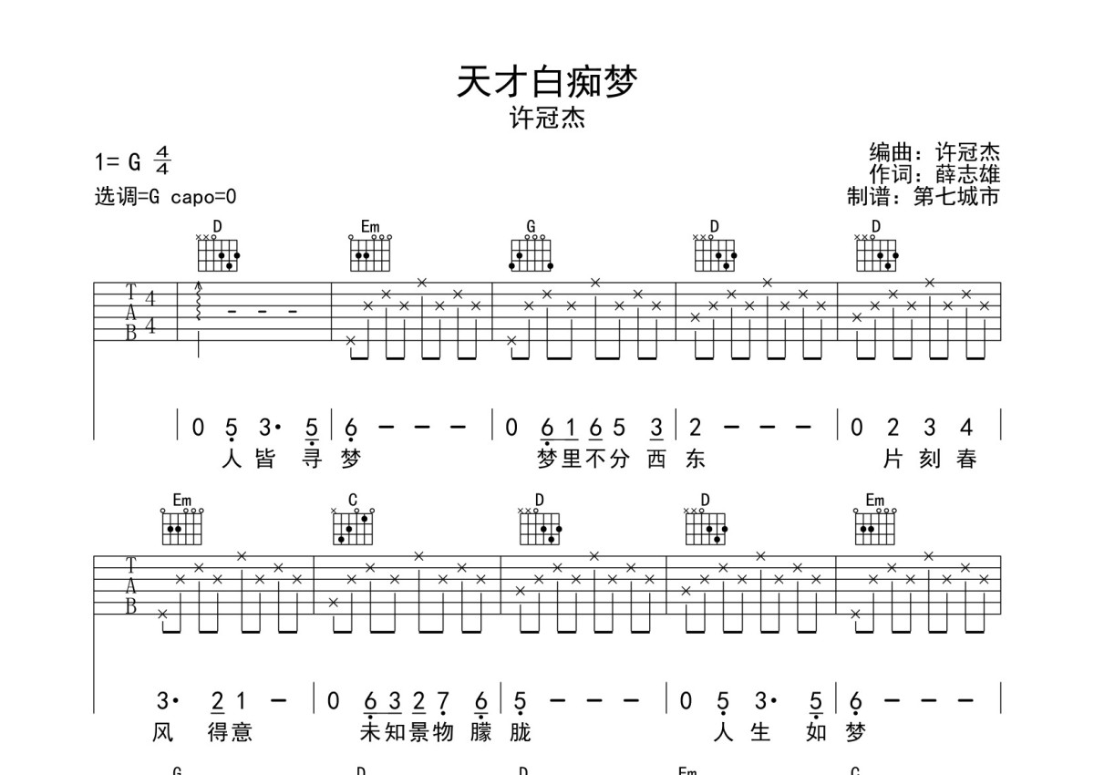 许冠杰《天才白痴梦》吉他谱 - G调弹唱六线谱