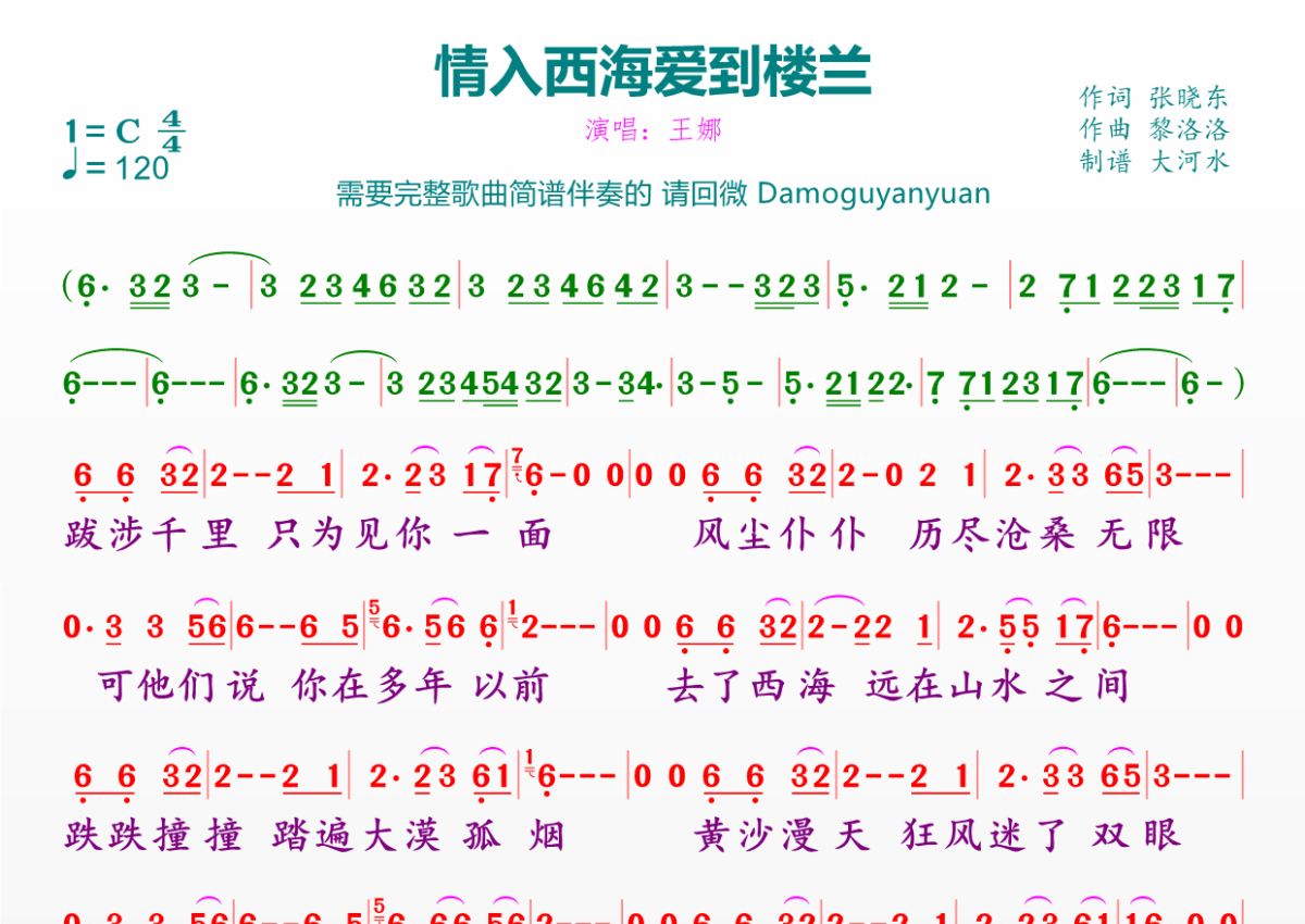 《情入西海爱到楼兰》是王娜演唱的一首歌曲,拍号为4/4拍,歌曲速度为每分钟120拍,这份简谱共有一张高清图谱,图谱由 @临海雪原 编配上传。