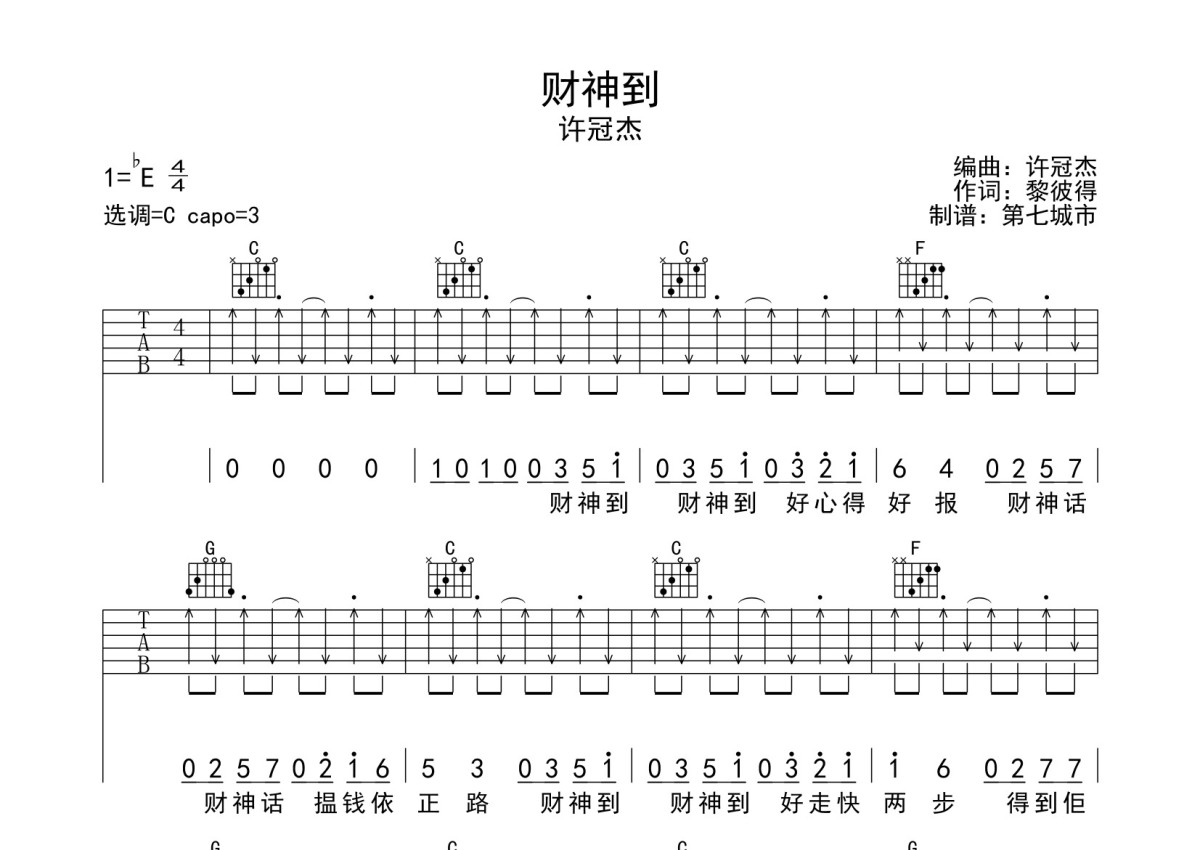 许冠杰《财神到》吉他谱 - C调弹唱六线谱