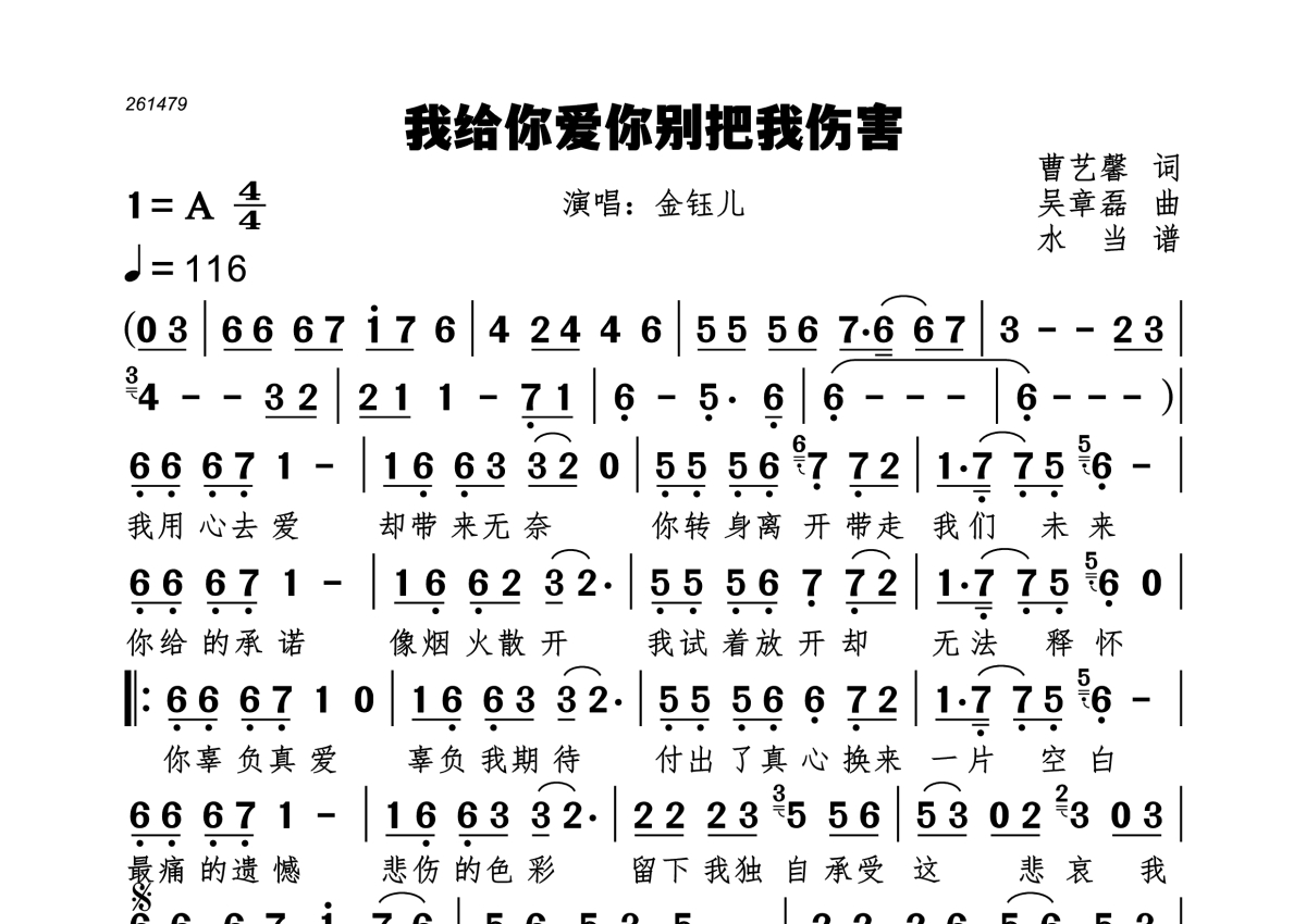 《我给你爱你别把我伤害》是金钰儿演唱的一首歌曲,拍号为4/4拍,歌曲速度为每分钟116拍,这份简谱共有一张高清图谱,图谱由 @水当 编配上传。