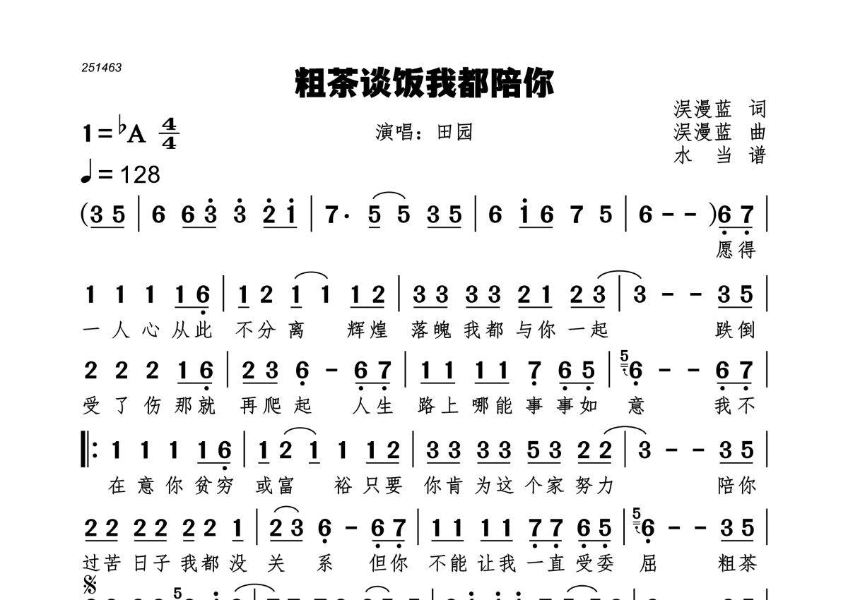 粗茶谈饭我都陪你简谱 - 田园演唱