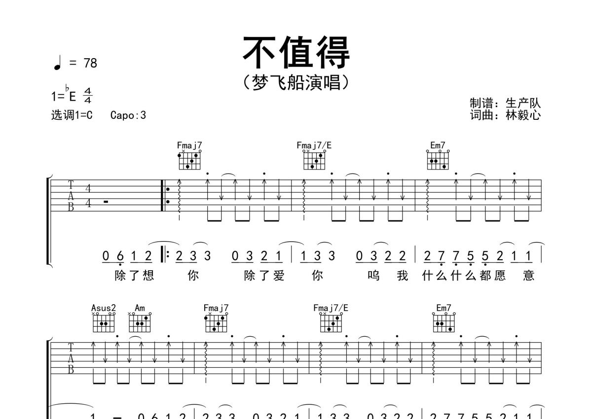 《不值得》是梦飞船演唱的一首歌曲,精编完美版,拍号为4/4拍,歌曲速度为每分钟78拍,歌曲原调为Eb调,但由于原调指法比较难,为了方便弹奏,本吉他谱采用的是C调指法编配,变调夹3品弹奏即为原调,当然也可以根据自己的音域改变变调夹位置,或者通过改变和弦调性,以方便自己弹奏,这份吉他谱共有三张高清图谱,图谱由 @生产队 编配上传,图谱使用六线谱编配,包含吉他和弦指法、简谱以及歌词部分,使用这份不值得吉他谱,可以让你更加方便地掌握这首歌曲的弹唱技巧,快来尝试吧。梦飞船演唱的经典歌曲《不值得》原版吉他谱,精编完美版,优质推荐!。
